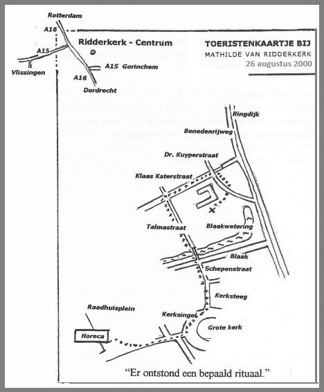 De voormalige bulldozermachinist uit Noord-Brabant ging elk jaar, tegen het einde van het voorjaar, terug naar de Zuid-Hollandse gemeente Ridderkerk. Er ontstond een bepaald rituaal. Eerst dronk hij koffie op het Raadhuisplein. Daarna wandelde hij via het Kerkpad de monumentale Kerksingel op. Hij vervolgde zijn wandeling door de Kerksteeg en Schepenstraat naar de Blaakwetering. Daar nam hij het bruggetje over de Blaakwetering naar de Talmastraat. Door de Klaas Katerstraat en Dr. Kuyperstraat wandelde hij om het gebouw van de voormalige Dr. A. Kuyperschool heen. Aan de oostzijde van het gebouw betrad hij het grasveld. Daar bleef hij dan in gedachten verzonken staan. Soms met tranen in de ogen. Soms met een glimlach op het gezicht.