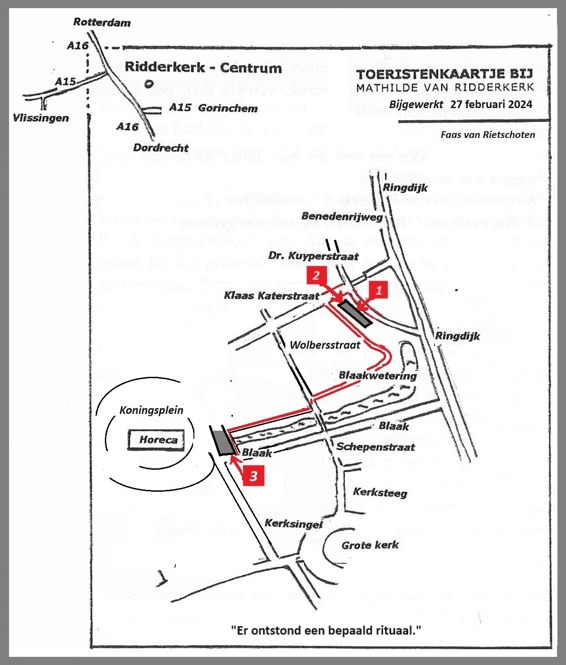 Aanvulling - Het bovenstaande vierentwintig jaar oude Toeristenkaartje bijgewerkt: 1 en 2 zijn nagemaakte muur kunstwerken, en 3 een origineel muur kunstwerk van de voormalige Dr. A. Kuyperschool.